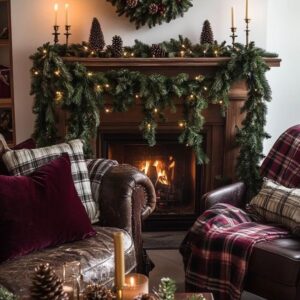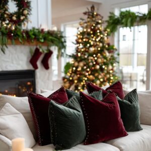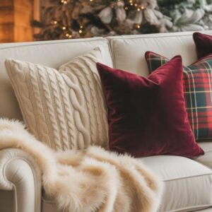 Les textures douces dominent. Elles créent des coins cocooning qui invitent naturellement à ralentir et profiter du moment. Pensez à des coussins tricotés, des bas de Noël en velours et des jetés texturés.